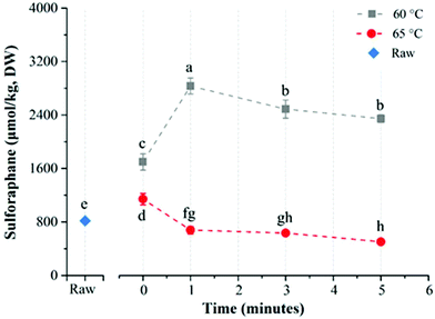 “For direct water blanching at 60°C, sulforaphane yield increased with treatment time from 1698.0 ± 121.9 μmol per kg DW (0 min) to 2833.3 ± 118.6 μmol per kg DW (1 min) and then steadily decreased to the lowest value of 2345.8 ± 57.7 μmol per kg DW for 5 min.