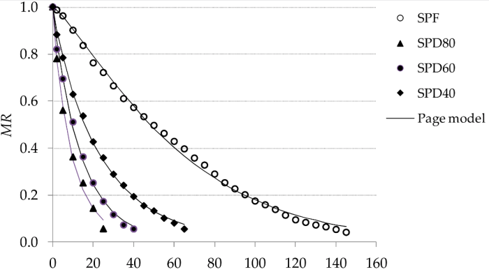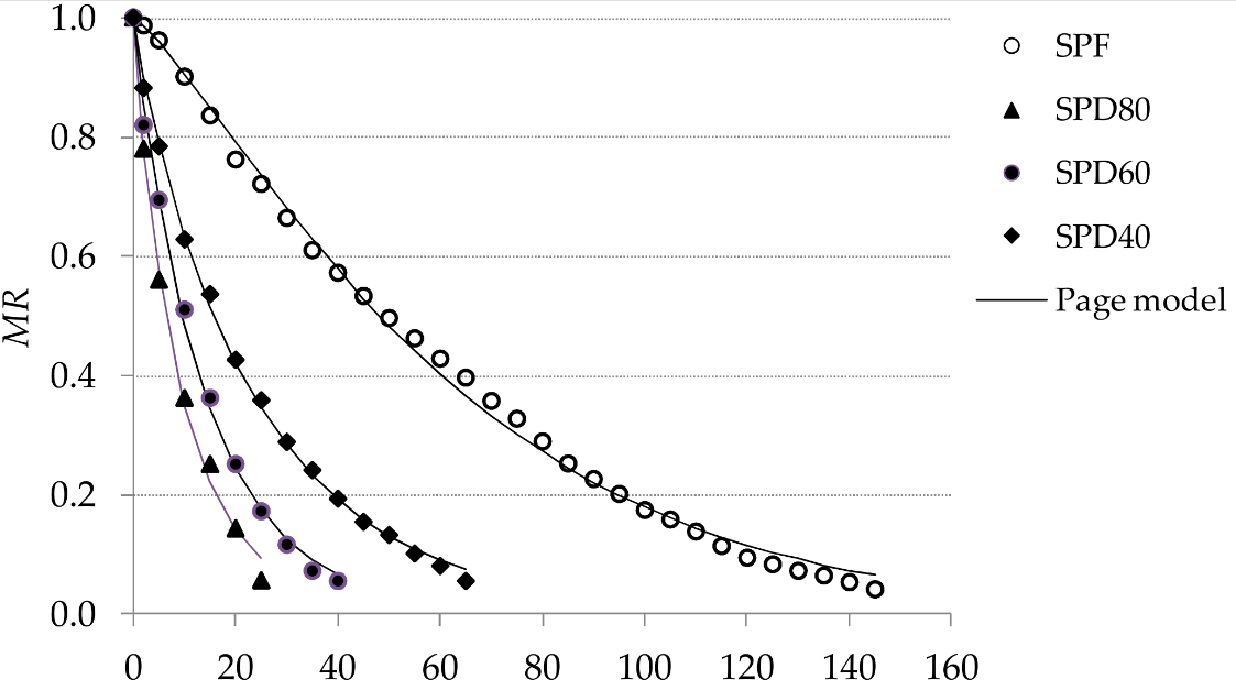 Drying curves of dried broccoli sprouts after 3 days of germination with experimental and predicted data based on the Page model: MR-moisture ratio, SPD40, SPD60 and SPD80-sprouts air-dried at 40, 60 and 80 °C, respectively, SPF-freeze-dried sprouts. [x axis in minutes]