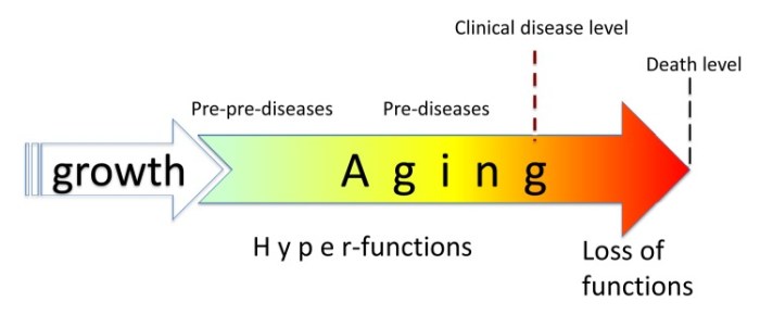 Instead of healthy aging, we could use the terms pre-disease aging or decelerated aging. Treatments are generally more effective at pre-disease stages, associated with hyper-function, than at disease stages, associated with functional decline.