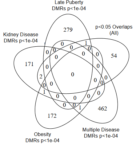 The number of differential methylated regions (DMRs) found in the transgenerational F3 males is between 100 and 500 for each individual pathology. Few DMRs overlap between the different pathologies which supports the possible use of epimutations as biomarkers of disease. Although further studies are required, the lack of a subpopulation of DMRs overlapping with all pathologies suggests that at a more stringent statistical threshold there are not common DMRs among specific diseases.