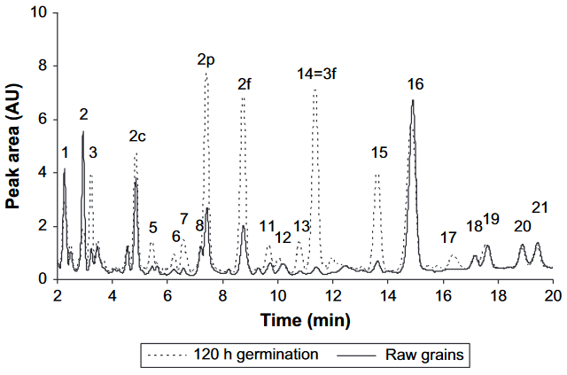 Previous studies also showed an increase in AVA content upon germination, but to a lesser extent than in our current experiment. It used different growth conditions, namely a shorter soaking time (10–14 vs. 20 h) and their seed germination phase was performed at lower temperature and different duration (120 h at 16 °C or 72 h at 20 °C vs 96 h at 30 °C).