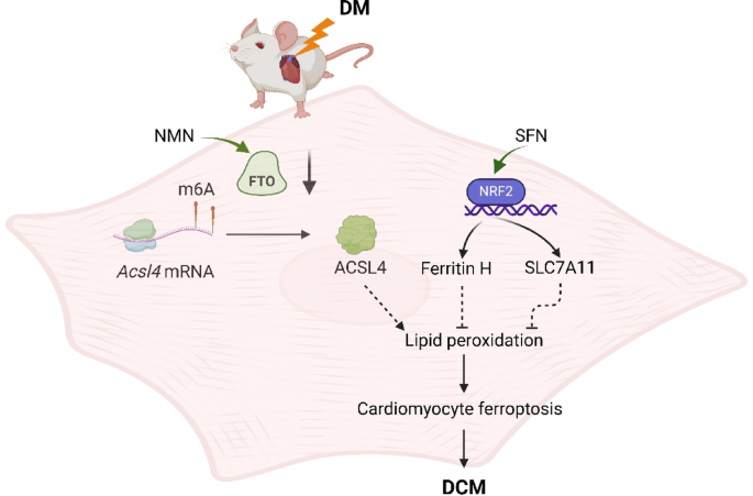 Enhancing the demethylase activity of FTO with NMN combined with SFN targeting NRF2 could synergistically reduce the level of lipid peroxides to inhibit ferroptosis, providing an effective avenue for alleviating DCM.
