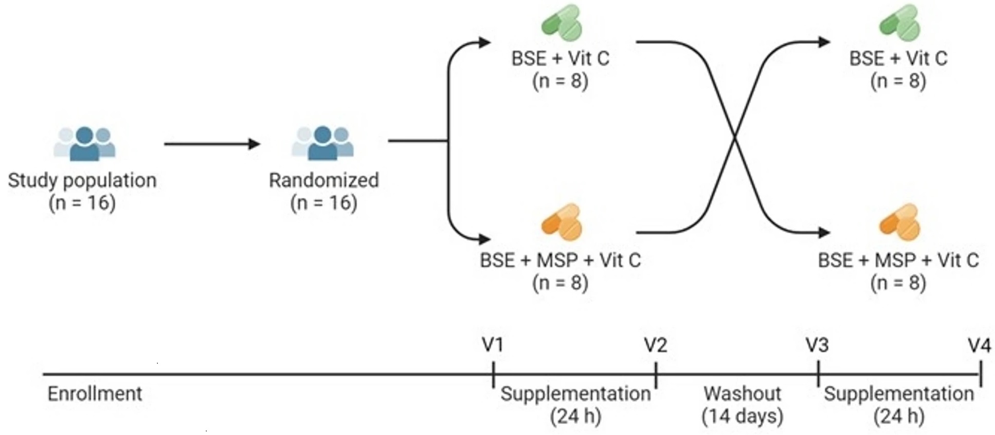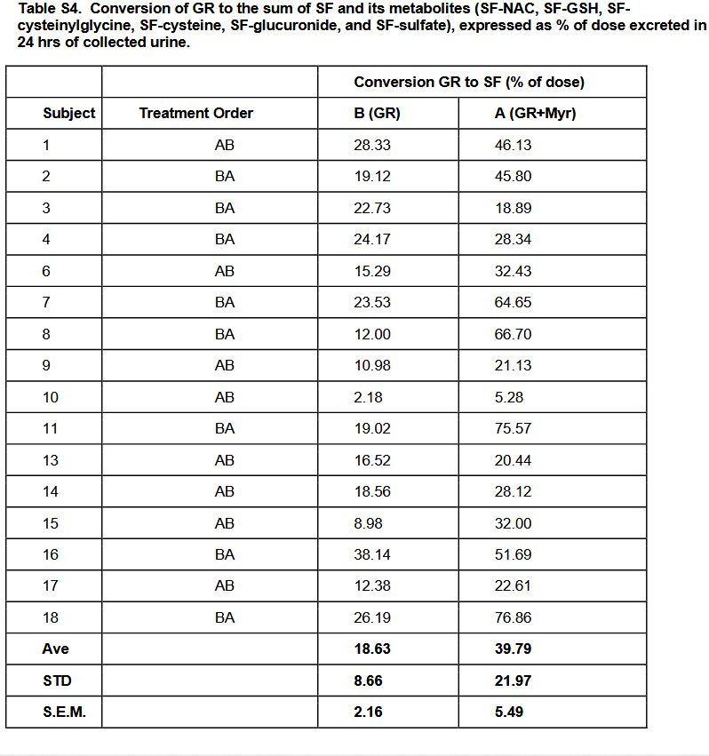 GR + Myr, on average, doubled the bioavailability of SF (39.8 ± 3.1%) compared to GR alone (18.6 ± 3.1%), and increased the conversion rate in the first 8 h (25.4% ± 2.7%) compared to GR alone (8.0% ± 2.7) based on measurement of urinary metabolites. The majority of subjects given GR as BSE with exogenous Myr and Vit C, converted GR to SF notably faster (e.g., within the first 8 h), than those given GR and Vit C alone.