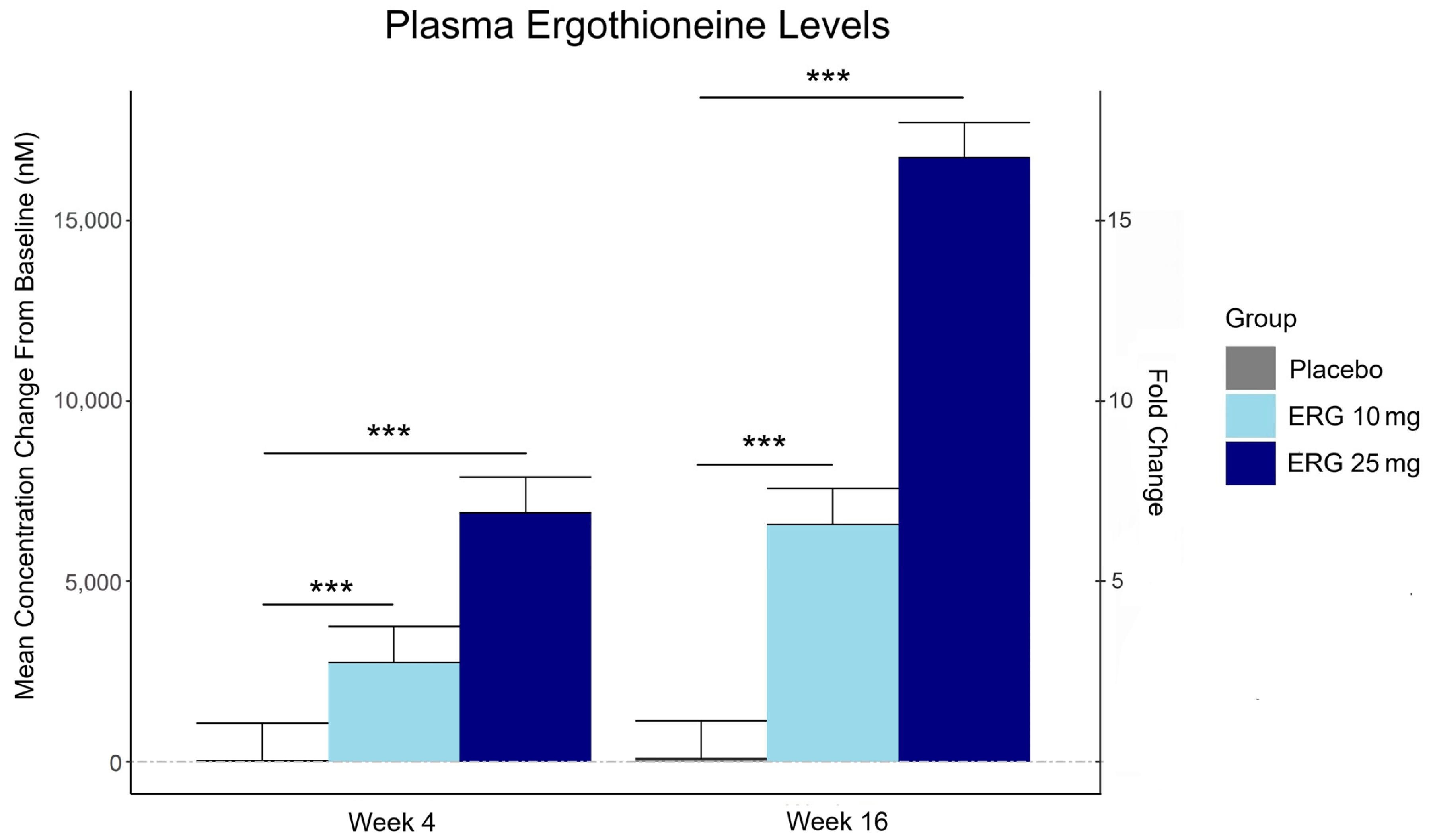 Plasma ergothioneine increased by ~3- and ~6-fold for 10 mg, and ~6- and ~16-fold for 25 mg, at weeks 4 and 16, respectively.