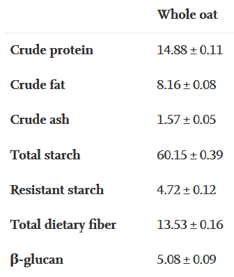 Pearled oats contained less protein, oil, ash, and other carbohydrates and AVAs, but more starch than whole grain. In contrast, oat bran contained more AVAs, protein, oil, ash and other carbohydrates but less β-glucan and starch as compared to whole grain.”
