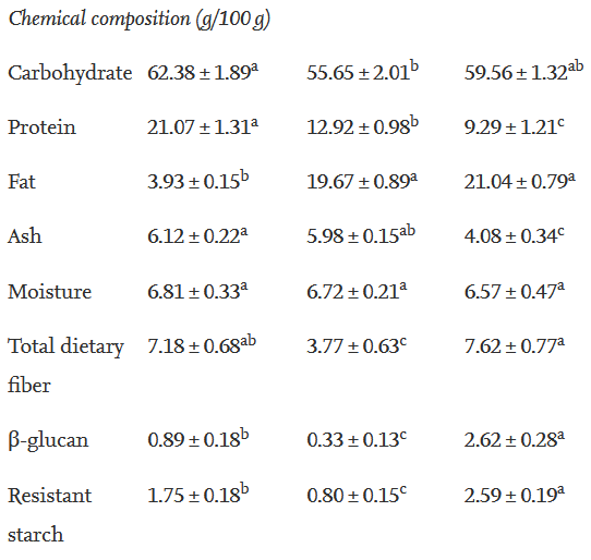 Pearled oats contained less protein, oil, ash, and other carbohydrates and AVAs, but more starch than whole grain. In contrast, oat bran contained more AVAs, protein, oil, ash and other carbohydrates but less β-glucan and starch as compared to whole grain.”